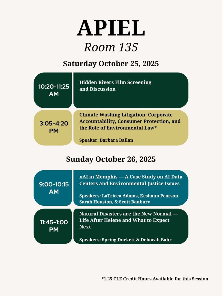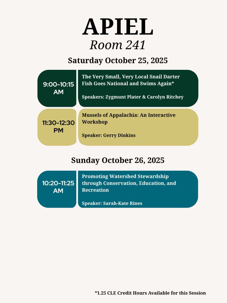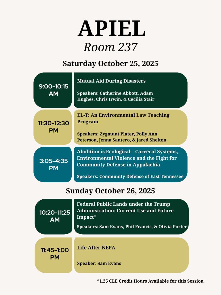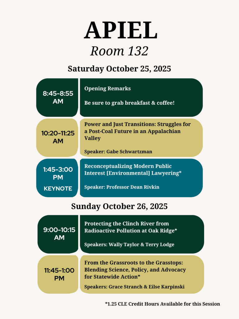 Mission Statement: APIEL is an annual gathering of lawyers, scientists, students, and members of the general public to discuss environmental issues and happenings in Appalachia, public policy, and grassroots initiatives. We aim to not only inform lawyers on the local areas of need but also how they can positively engage with their community to be forces of change in the legal realm.